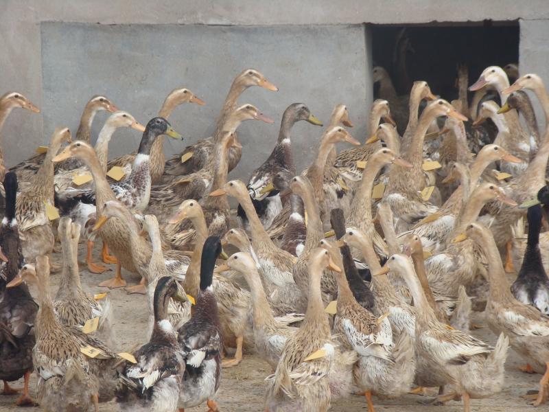 代表鸭种:高邮麻鸭高邮麻鸭属肉蛋兼用型鸭种,是中国四大名鸭之一。麻鸭因其母鸭羽毛都呈麻褐色而带黑斑纹,故而得名。高邮鸭母鸭全身羽毛褐色,有黑色细小斑点,如麻雀羽;喙豆黑色;虹彩深褐色;胫、蹼灰褐色,爪黑色。公鸭体型较大,背阔肩宽,胸深躯长呈长方形。头颈上半段羽毛为深孔雀绿色,背、腰、胸为褐色芦花毛,臀部黑色,腹部白色。喙青绿色,趾蹼均为桔红色,爪黑色。高邮麻鸭善潜水、耐粗饲、适应性强、蛋质好。由于放养环境多为湖荡湿地,生长发育快、易育肥、肉质好。